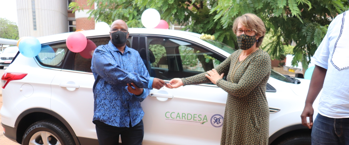 “The outputs that GIZ Adaptation to Climate Change in Rural areas in Southern Africa (ACCRA) produced, including the knowledge products will continue to benefit the stakeholders now and in the next 30 years”, these were the resounding words of CCARDESA’s Executive Director Dr Cliff Dlamini during the ACCRA handover ceremony of a Ford Kuga motor vehicle and other office equipment. The colourful event was held at CCARDESA Secretariat on 4th December 2020 and graced by staff from both CCARDESA and the ACCRA programme. Also, in attendance was the GIZ -Transboundary Use and Protection of Natural Resources Programme (TUPNR) Manager Dr Dieter Nill.