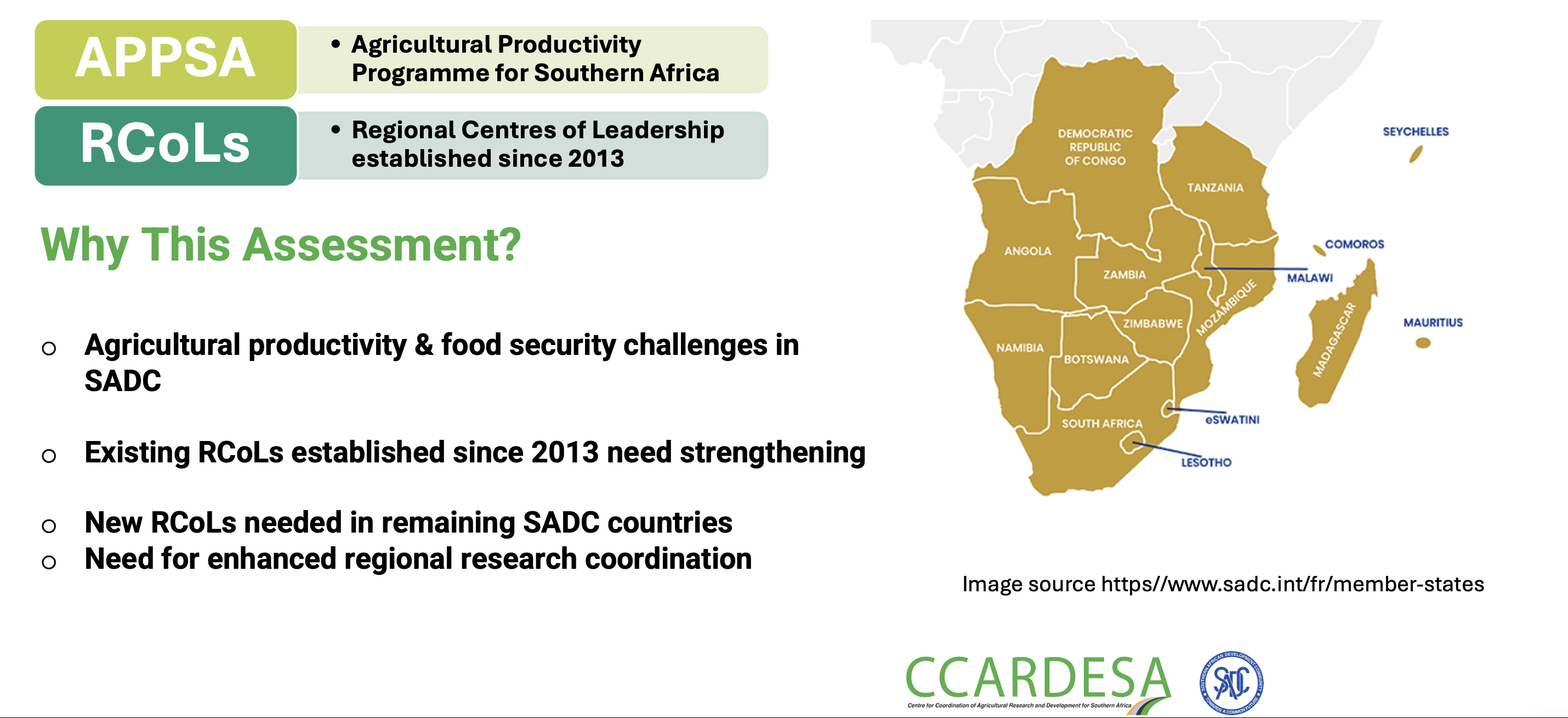 The Southern African Development Community (SADC) region faces persistent agricultural productivity and food security challenges, exacerbated by climate change-induced droughts, erratic water supplies, infrastructure deficits, and low investment in agricultural research. To address these pressing issues, the Centre for Coordination of Agricultural Research and Development for Southern Africa (CCARDESA) has been at the forefront of establishing and strengthening Regional Centers of Leadership (RCoLs) to drive agricultural innovation and knowledge-sharing across the SADC region.