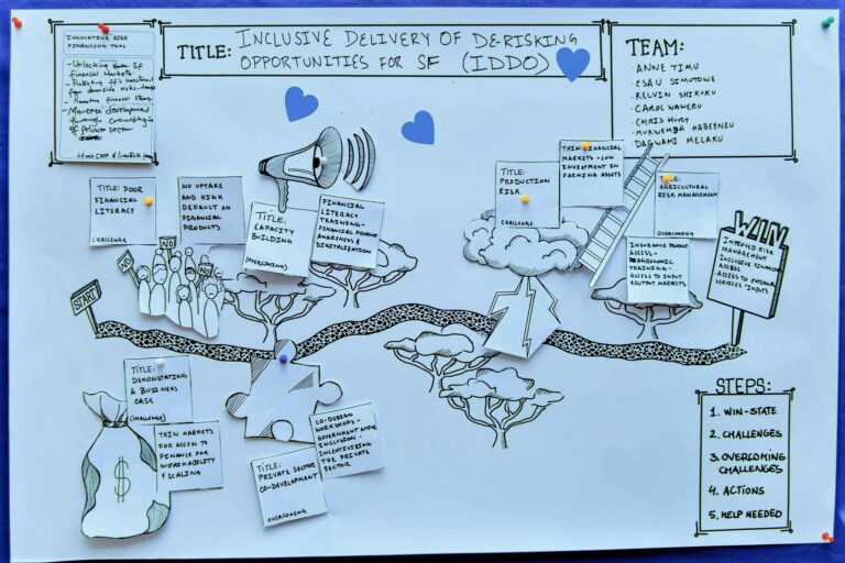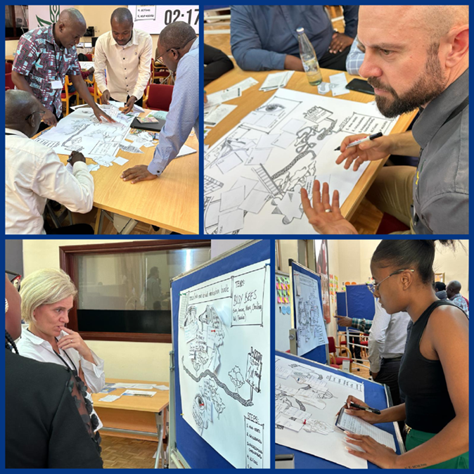 Dividing into a dozen table groups, Ukama Ustawi’s agricultural scientists and development partners reviewed IPSR scores and narratives for all 16 Ukama Ustawi innovations. Each table was asked to select the single innovation they thought most likely to succeed. The tablemates then worked together to fill in a map showing the path leading from the start of the innovation they had chosen to its impact, with descriptions of what a “win-state” would look like, the challenges to be overcome, the actions to take and the help needed for the innovation to have big impact.