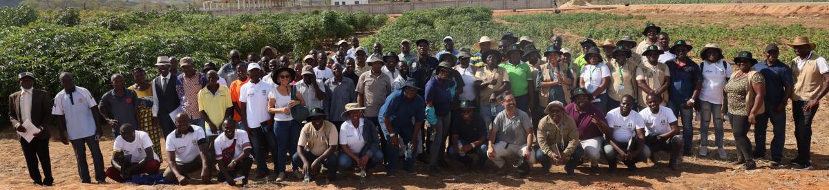 Delegates posing in front of the cassava genebank at Mazozo Research Station