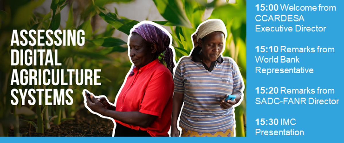 In his remarks, Mr Gove noted that this study is aligned with the Regional Agricultural policy framework as it contributes towards the agricultural transformation agenda of SADC. “Agriculture is the first pillar under the Regional Indicative Strategic Development Plan (RISDP, 2020-2030) and such initiatives have the potential to address most of the challenges in the sector such as access to improved technologies, climate smart agriculture and many others”, added Mr Gove when delivering his opening remarks. Dr Simon Mwale, who was speaking on behalf of the Executive Director and Head of Mission, Dr Cliff Dlamini further highlighted that digitalization in agriculture is a game changer as it contributes significantly to increased productivity, profitability, adaptation and resilience to climate change. Speaking on behalf of the World Bank, Dr Marie-Agnes Jouanjean thanked CCARDESA for facilitating the study and IMC for delivering a quality product. She further noted, with appreciation, the critical role played by the SADC FANR Directorate in making this study a reality.