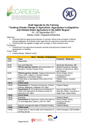 CCARDESA organised a training in September 2017 in Ongwediva, Namibia. This training was based on the CCARDESA Training Package which is being rolled out in the SADC region. The objectives of the training were to train participants on the Climate Proofing (CP) approach with a focus on Climate Smart Agriculture (CSA), to enable them to apply these concepts in their individual working contexts, getting to know concepts of climate change adaptation and climate smart agriculture for agricultural extension services,  and to use feedback and lessons to further improve the training for future application in the region.