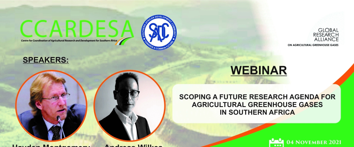 The region grapples with the rising temperatures and increased frequency and intensity of extreme weather events which have severe consequences on ecosystem services and agricultural productivity. These and many more have pushed the Southern African countries to address climate change challenges through targeted research actions. To do this, CCARDESA, in conjunction with the Global Research Alliance, will convene a webinar on: SCOPING A FUTURE RESEARCH AGENDA FOR AGRICULTURAL GREENHOUSE GASES IN SOUTHERN AFRICA, to which you are cordially invited on :