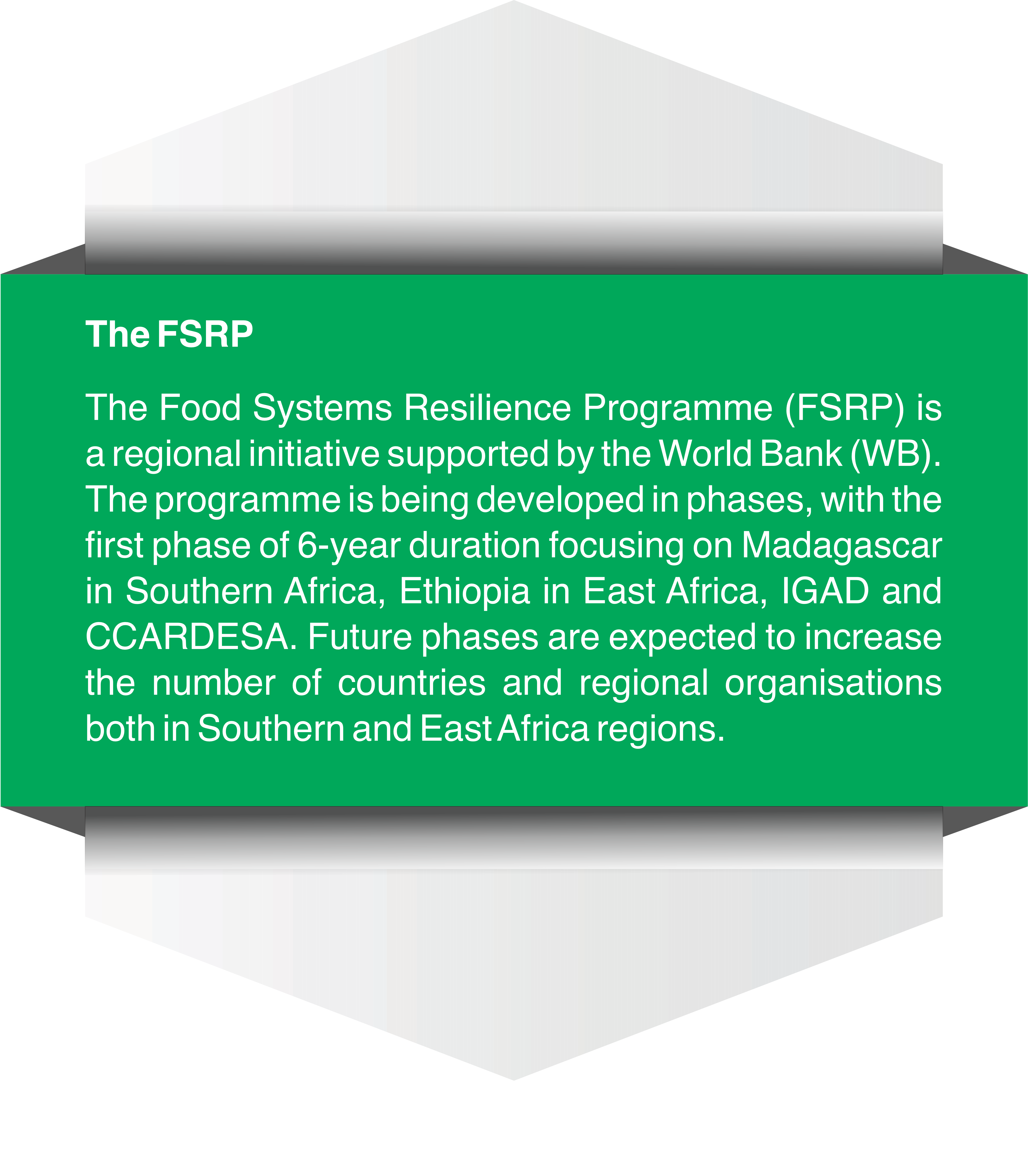 The Southern Africa Food Systems Resilience Programme (FSRP) supports countries in the SADC region in building climate-resilient food systems, improving agricultural productivity, and strengthening regional collaboration. The implementing countries include Madagascar, Malawi, Tanzania, and Comoros.